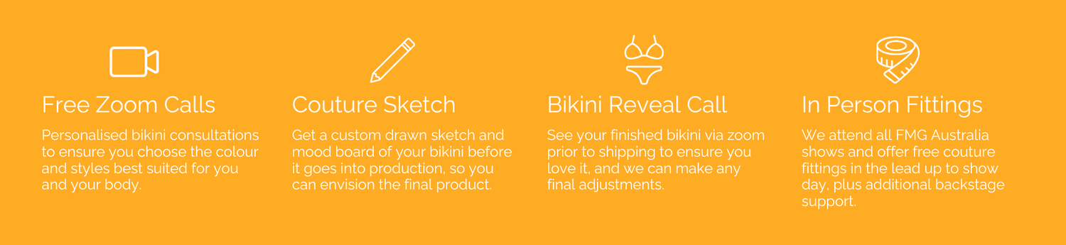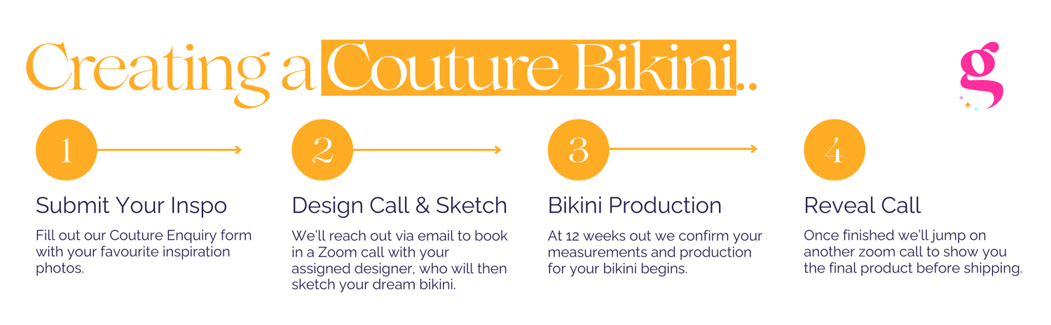 We know it can be a difficult and overwhelming decision to order a couture bikini. Our designers will work with you to sketch a unique bikini design based on your inspiration images. The price of the enquiry covers our designer's time researching, sourcing materials, and sketching your bikini, and does not go towards the cost of the bikini itself. We guarantee we will work extremely hard to bring your ideas to life and create a couture bikini that you will love. If you have any questions or ideas you’d like to discuss, we’re always here to help!