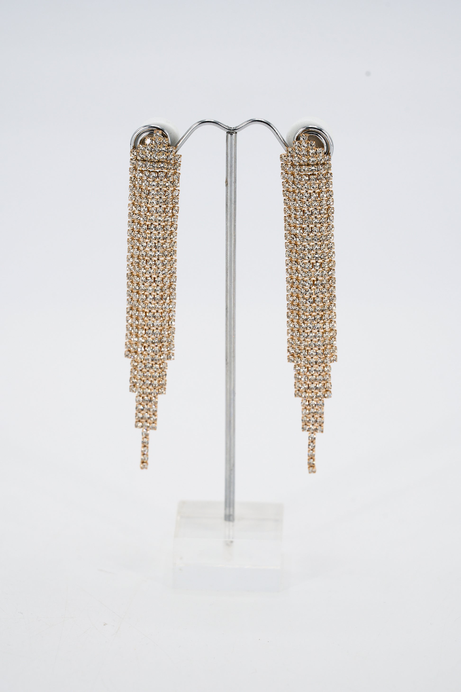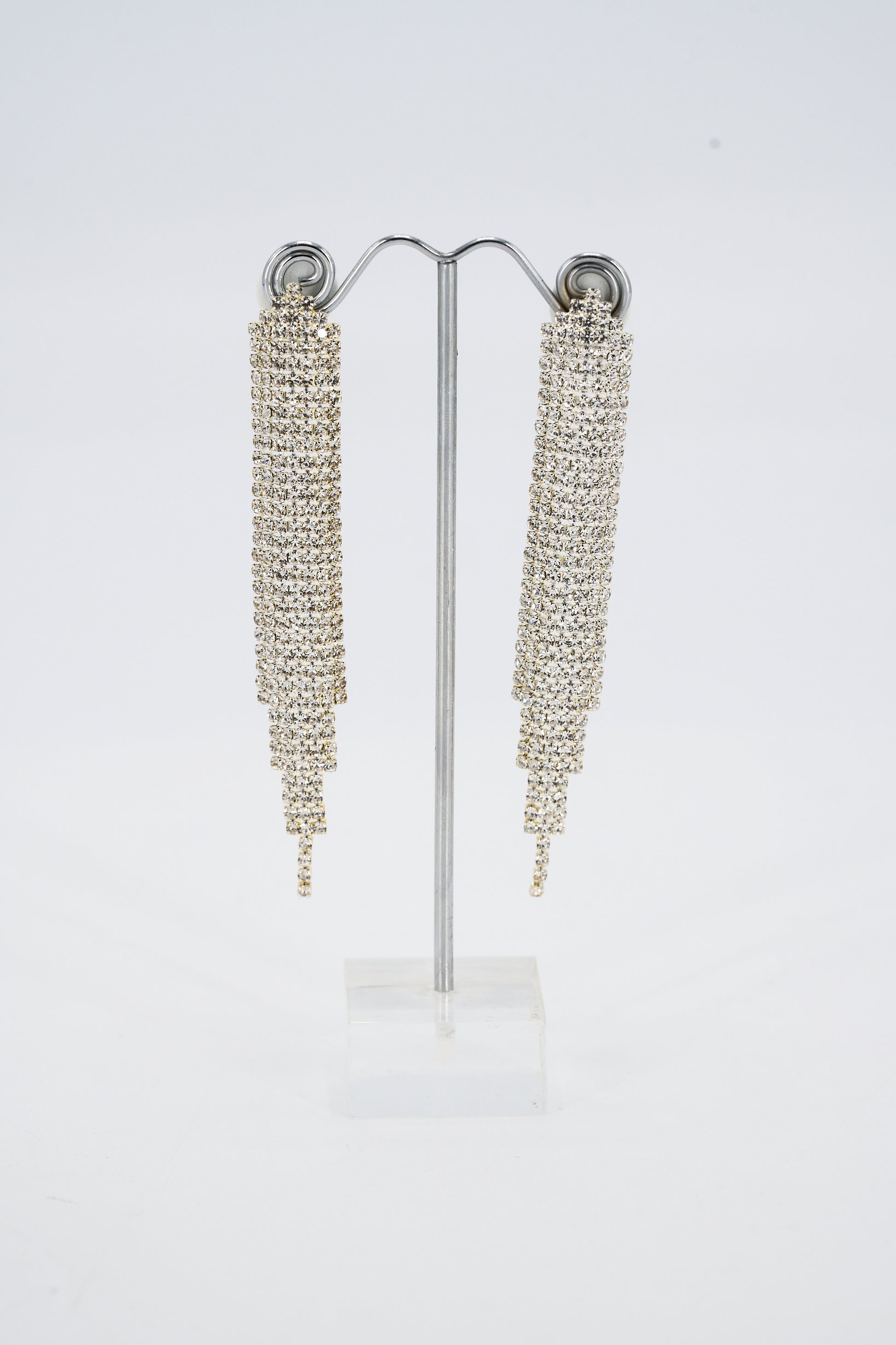 Our Alicia Earrings have an elegant dangle design in a long sleek shape. Overall they are 8.5cm long and 1.5cm wide in AB rhinestones.